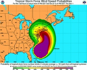 Sandy is a much bigger storm – a “Frankenstorm” they are calling it – with higher sustained winds and is coming ashore accompanied by the highest tides of the fall and a full moon. If the predicted storm track is correct, it will go through less than 100 miles south of Manhattan but has a wind pattern over 200 miles wide.