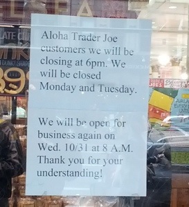 Most businesses in Manhattan seem to have taken a “storm day”. Restaurants are closed as well and only a few small grocery store/delis are open. With no public transportation employees can’t get into their jobs. One store owner in our neighbourhood slept in his store last night so he could be open today.